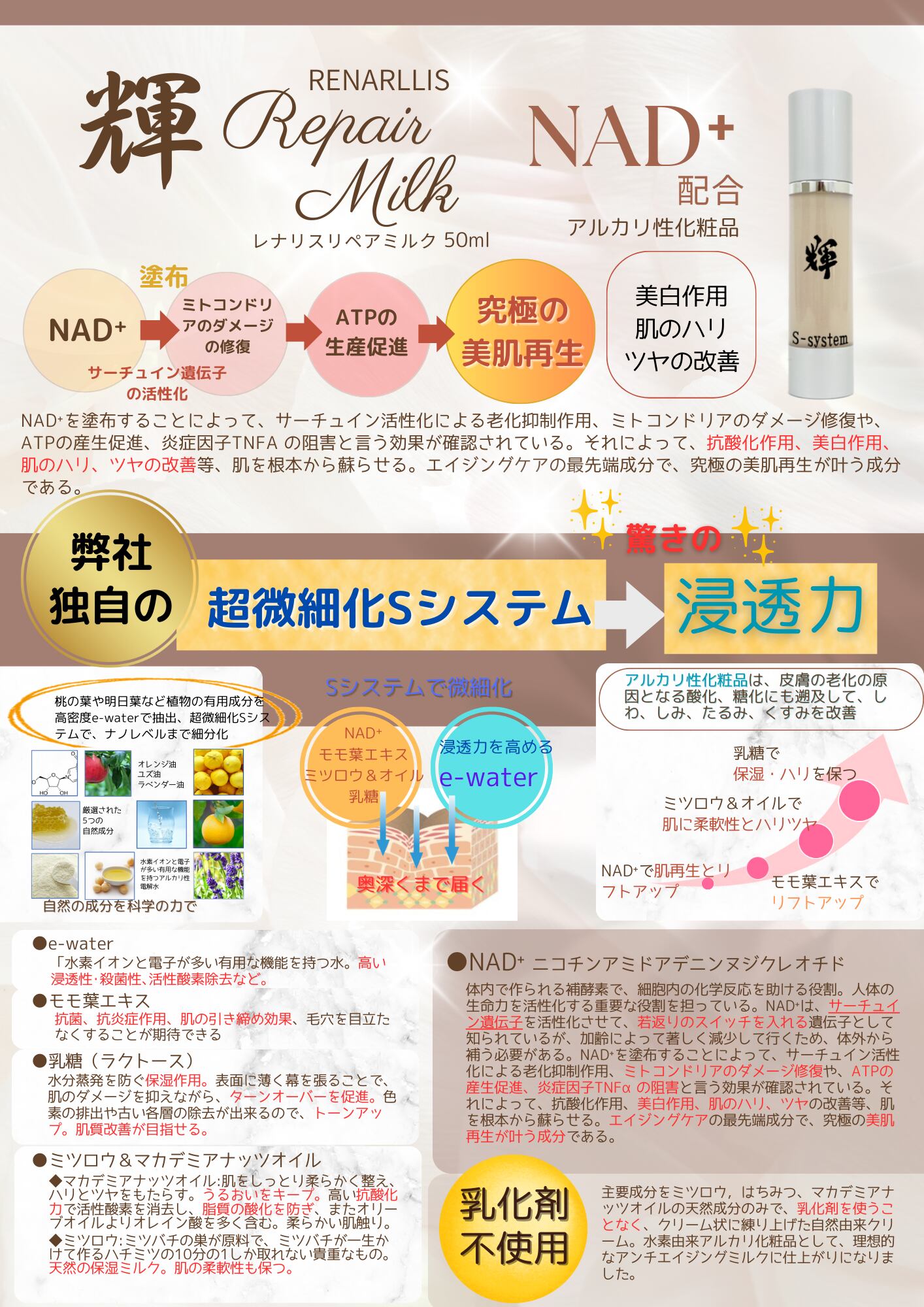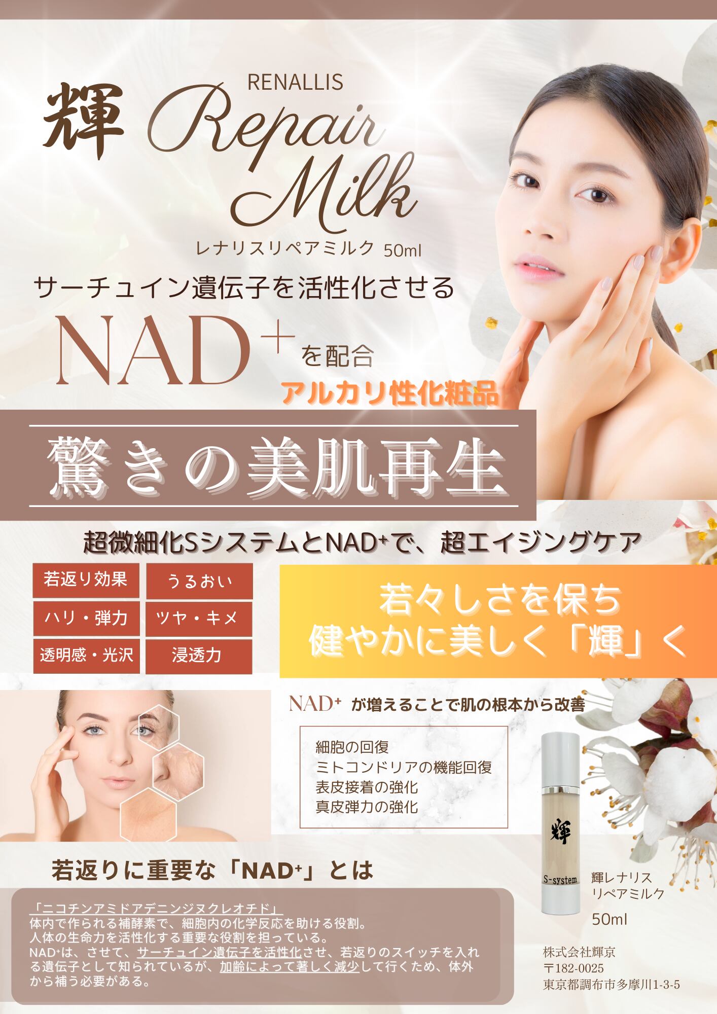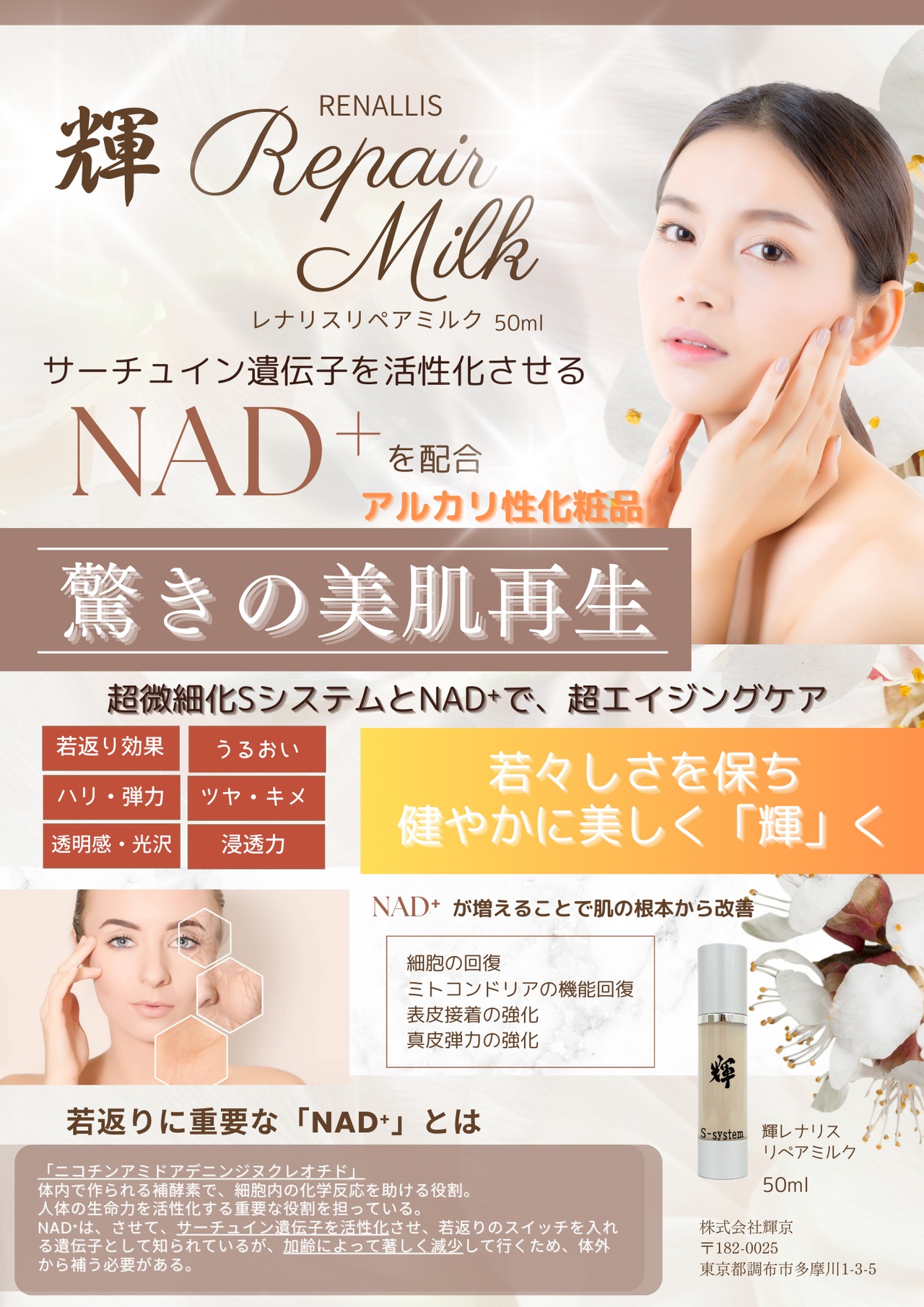 サーチュイン遺伝子を活性化させる「NAD+」を配合したアルカリ性化粧品です。